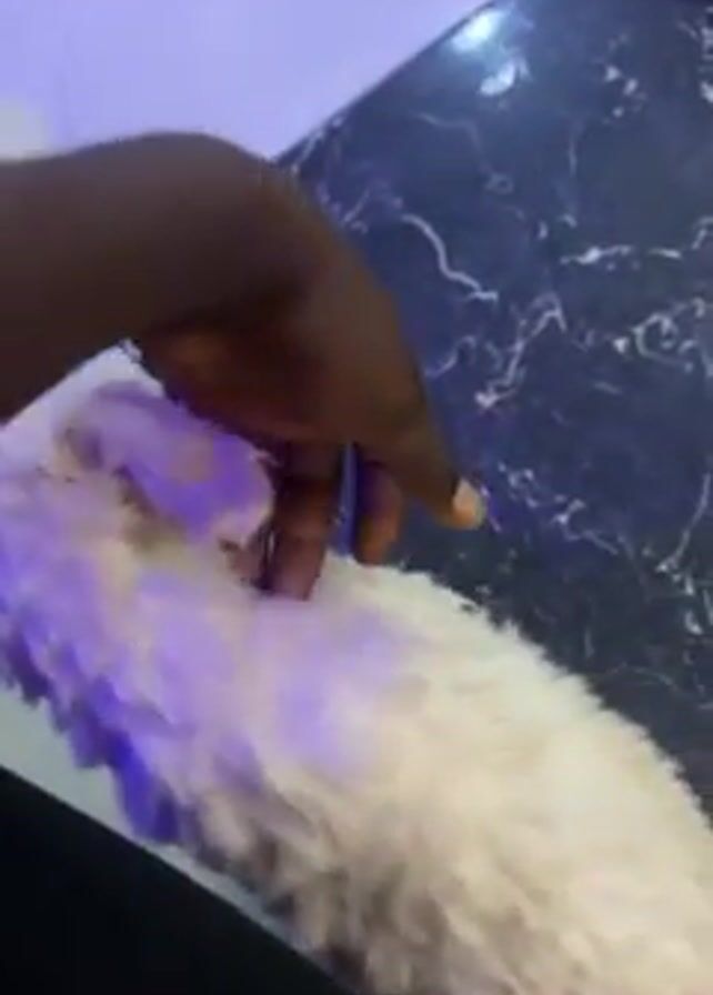 A person’s hand pets a fluffy, small, white dog lying on a black, marbled floor. The tiles are shiny and reflect a blue light from above. The dog rolls over and looks up at the person petting it. The hand continues to stroke the dog.