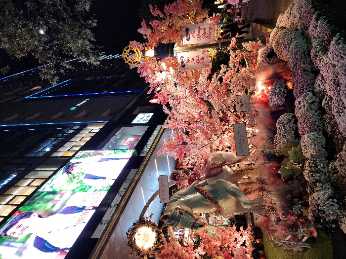 The image depicts a nighttime street scene in Nha Trang, Vietnam, in front of the Gold Coast complex. A large, brightly illuminated outdoor festive display occupies the foreground and midground. Central to the display is a white, glossy statue of a horse, adorned with pink accents and a saddle. This statue is situated on a raised platform covered with pink and white artificial floral arrangements resembling chrysanthemums and feathery grasses. Numerous artificial pink cherry blossom trees or branches, also illuminated, frame the horse statue and extend towards the right. A sign reading "GOLD COAST" is visible within the display, along with banners containing Vietnamese text such as "Vạn Sự Như Ý" and "An Khang Thịnh Vượng," suggesting New Year or celebratory greetings. In the background, the Gold Coast building rises, a tall, modern structure with a dark facade, illuminated windows, and distinctive vertical blue LED light strips. A large LED screen integrated into the building's facade displays bright images, including smiling individuals (one appearing to be a child, another an adult). To the right, a paved sidewalk is visible, with several indistinct human figures walking in the distance. Dark real tree foliage is present against the night sky in the upper right. A decorative street lamp with a circular, possibly golden, emblem is also visible on the right, partially obscured by the cherry blossoms. The overall environment is urban and festive, indicating a public space.