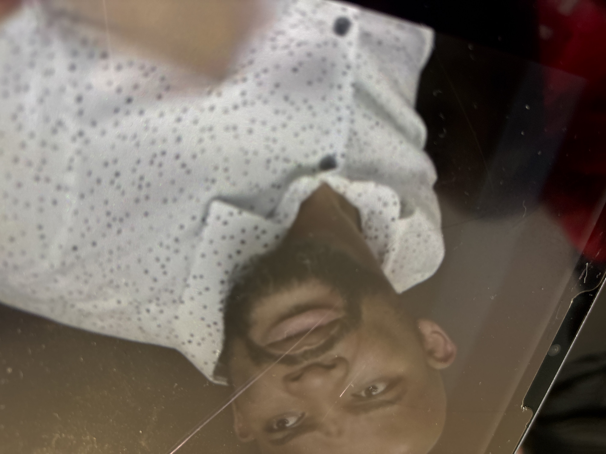 The image displays a photograph of a digital screen depicting an adult dark-skinned male with a shaved head and a dark beard. The man is wearing a light-colored, possibly white or light grey, collared shirt adorned with numerous small dark dots. His eyes are wide and focused slightly upward and to the viewer's left, with furrowed eyebrows, and his mouth is slightly agape, conveying an expression of surprise or concern. The screen itself exhibits multiple visible cracks or scratches, predominantly diagonal, across its surface, obscuring parts of the man's face and torso. A dark bezel or frame of the digital device is visible along the left edge of the image, showing minor damage or wear near the top left corner. A reddish reflection is present in the lower-left corner of the screen. The scene is located in Midrand, South Africa.