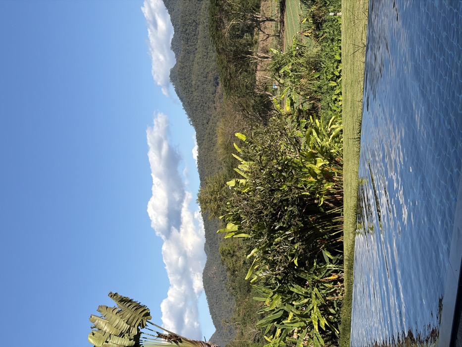 The scene, located in Pai, Thailand, displays a bright outdoor landscape. In the lower foreground, a dark-tiled infinity pool with a rippled water surface is visible. Immediately beyond the pool is a narrow strip of manicured green grass, which transitions into dense tropical vegetation. A large Traveler's Palm is partially visible on the far left. The midground features various broad-leafed tropical plants and trees, including some with sparse foliage, and an agricultural field with distinct rows of green crops on the right. In the background, rolling, densely forested mountains stretch across the horizon. Above the mountains, the sky is clear blue with scattered white cumulus clouds. The entire scene is illuminated by natural sunlight, indicating a daytime setting. No individuals or specific actions are depicted.