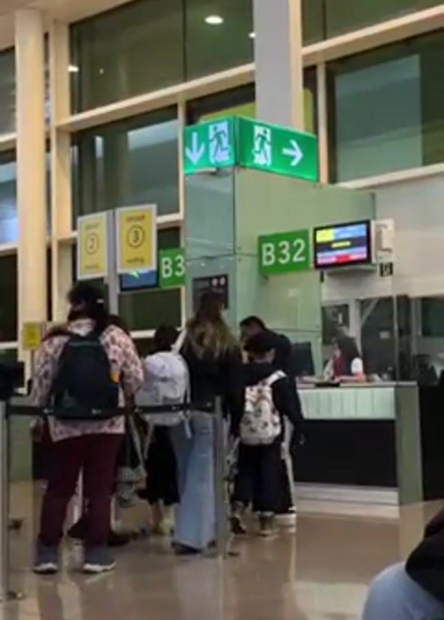 In an indoor airport scene, a group of people are queuing at gate B32. The people are of various ages, including children, and are wearing casual clothing and backpacks. An airport employee wearing a red scarf sits behind a counter, seemingly checking boarding passes or documents. Above the counter are illuminated signs indicating the gate numbers and an exit sign with arrows pointing down and to the right. The airport environment appears modern, with large windows in the background. The lighting is bright, and the overall scene suggests the typical hustle and bustle of an airport.