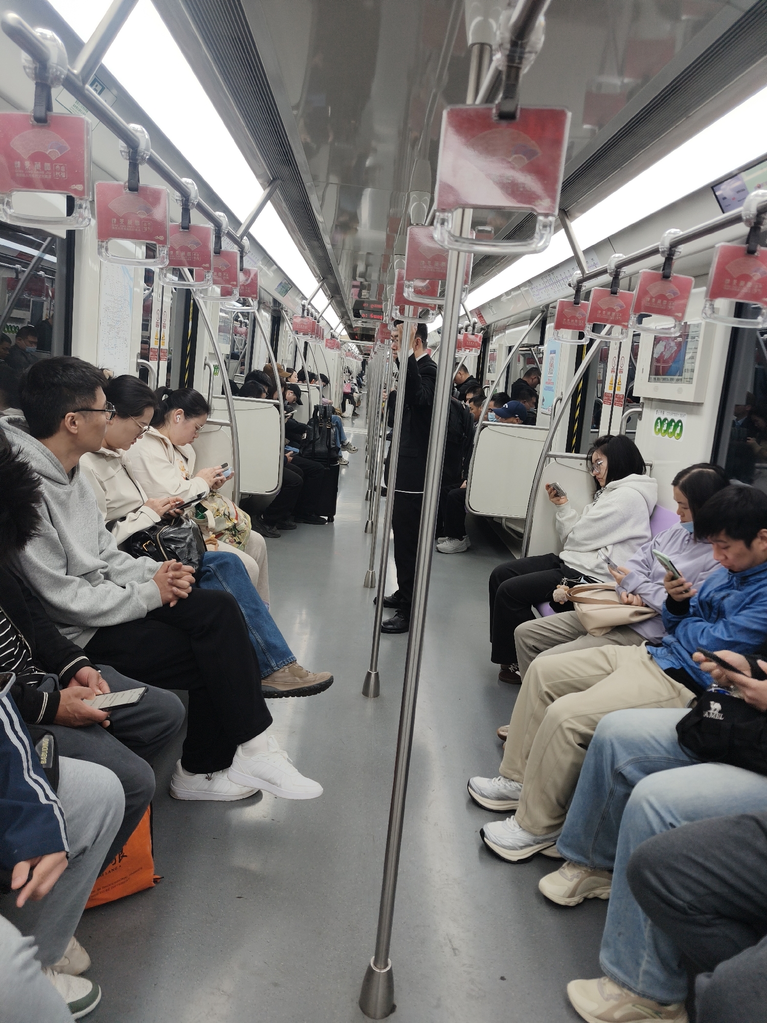 The image depicts the interior of a subway car. Passengers are seated on both sides of the aisle, many are looking at their phones. The car appears modern and well-lit. Red, square signs hang from the ceiling fixtures, adorned with graphics and text. There are several poles positioned throughout the car for passengers to hold onto.
