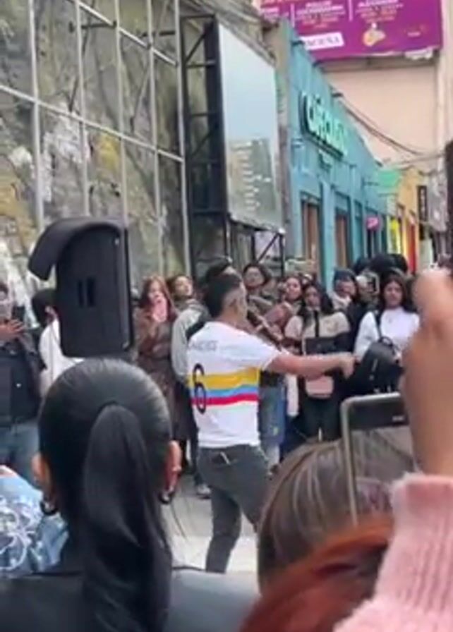 crowded street scene with a man in a white shirt with colorful stripes and the name “RICHARD RIOS” and the number six on the back, singing or speaking into a microphone. He is standing in front of a small PA speaker. A crowd of people, many holding up their phones to record, surrounds him. Some people are smiling and looking at the singer. The street has buildings on both sides. One building has a light blue facade with "CIRKUS" written on it. Another building has a large banner advertising “TEATRO AL AIRE LIBRE”. The atmosphere is lively and informal.