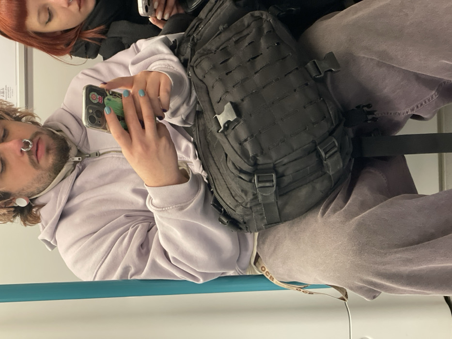 A forensic examination of the image reveals a scene inside a metro train, identified as part of the Sofia Metro system in Sofia, Bulgaria. The central figure is a person with light brown hair, a beard, and a silver septum piercing, wearing white ear gauges. This individual is dressed in a light purple hooded zipper jacket over a cream-colored turtleneck and light brown trousers. A white strap with "OCB" lettering is visible near their hip. They are holding a smartphone, likely an iPhone in a clear case with a green cartoon-like graphic, with both hands; their fingernails are painted teal blue and purple. A black tactical-style fanny pack or sling bag with MOLLE webbing and several buckles rests on their lap. To the right, partially visible, is another individual with red hair and a nose piercing, wearing a dark jacket and a black scarf. This person is also holding a smartphone. Both individuals are engaged with their devices, with no direct interaction observed between them. The immediate environment includes a white wall, a prominent light blue vertical support pole, and a gray floor. A poster with illegible Cyrillic text is partially visible in the upper background.