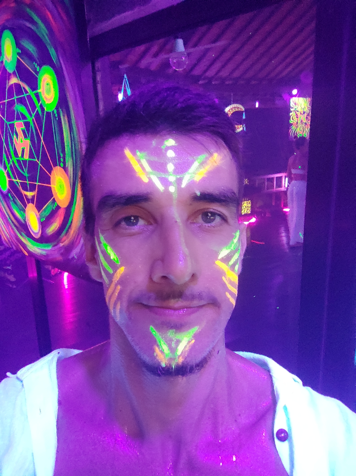 This image captures a male individual within an indoor venue in the city of Lokaserena, Indonesia, illuminated by ultraviolet light. The subject, positioned centrally and shown from the upper chest, possesses dark hair and light facial stubble, gazing directly at the camera. His face and exposed chest are adorned with intricate patterns of fluorescent body paint, glowing in green, yellow, and orange hues. He wears a light-colored, likely white, collared shirt, unbuttoned at the neckline. To the left, a large mural or wall decoration features glowing green, yellow, and orange geometric patterns, including concentric circles and a prominent "A"-shaped symbol. To the right, another person is partially visible in the background, clad in white clothing that also fluoresces under the UV light. The environment includes various additional glowing decorations, such as hanging fixtures and a rectangular wall piece with intricate designs, set against a dark floor and overhead wooden ceiling beams.
