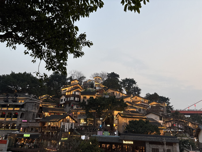 The image displays a densely built, multi-tiered urban hillside settlement identified as being in Nan'an District, China. The scene is captured at dusk or early night, evidenced by the ambient sky light and extensive artificial illumination of the structures. Numerous traditional Chinese-style buildings with dark tiled roofs and light-colored facades are constructed into a steep slope, appearing as a cascade of terraced structures. Nearly every building is extensively lit with warm, yellow-toned artificial lights outlining architectural features such as eaves, windows, and balconies. A large tree branch with dark foliage extends across the upper-left quadrant of the foreground, partially obscuring the sky and distant buildings. The sky above is a pale grey-blue, transitioning to a subtle reddish-orange hue closer to the horizon. Additional trees and shrubs are interspersed throughout the hillside, some with bare branches. On the lower and mid-level terraces, groups of people are visible on outdoor platforms and balconies, appearing to be patrons of various establishments, engaging in social activities or dining. An illuminated sign for "BEGONIA" is visible on a prominent building in the mid-left. A large, red metal bridge structure is partially visible in the far right background, spanning an unseen body of water or valley.