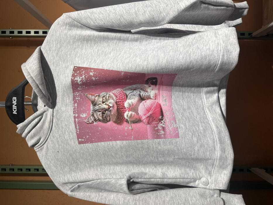 - "A light grey melange hooded sweatshirt hangs on a black plastic hanger marked with "KING" in white uppercase letters" by FM-A8Ieo2, licensed under CC BY 4.0