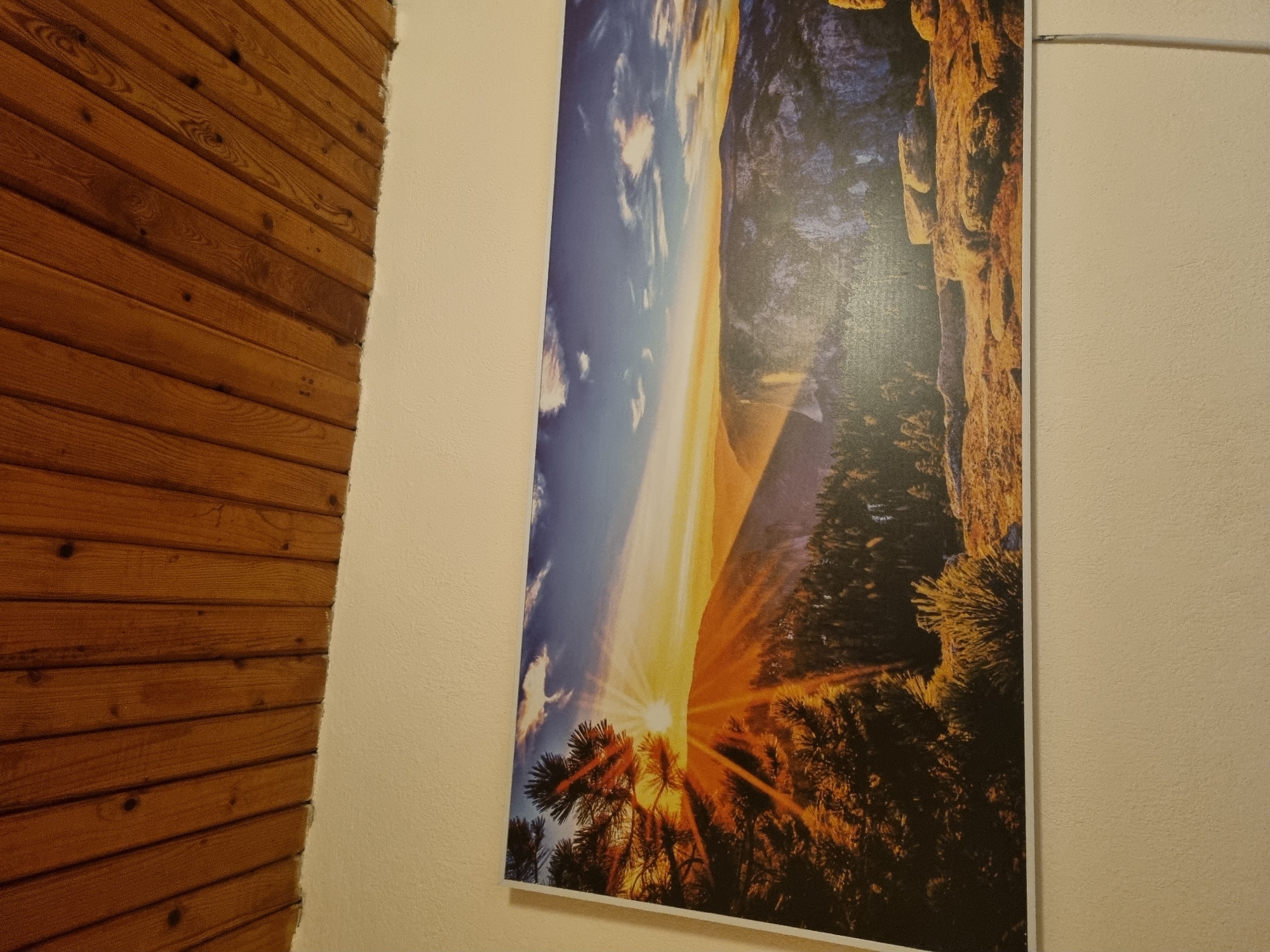 section of a wall in Galabovtsi, Bulgaria. A portion of a wall constructed from horizontal wooden planks is visible on the left. To the right of this section is a plain, light-colored wall where a large, rectangular print is hung. The print depicts a landscape with elements of mountains, trees, and a sunrise or sunset. The light source appears to be originating from within the print, casting rays outwards. A thin, metallic wire runs along the top right section of the wall.