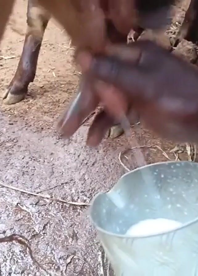 - "A person wearing a beaded bracelet milks a brown cow with a metal cup" by FM-30VUD3, licensed under CC BY 4.0