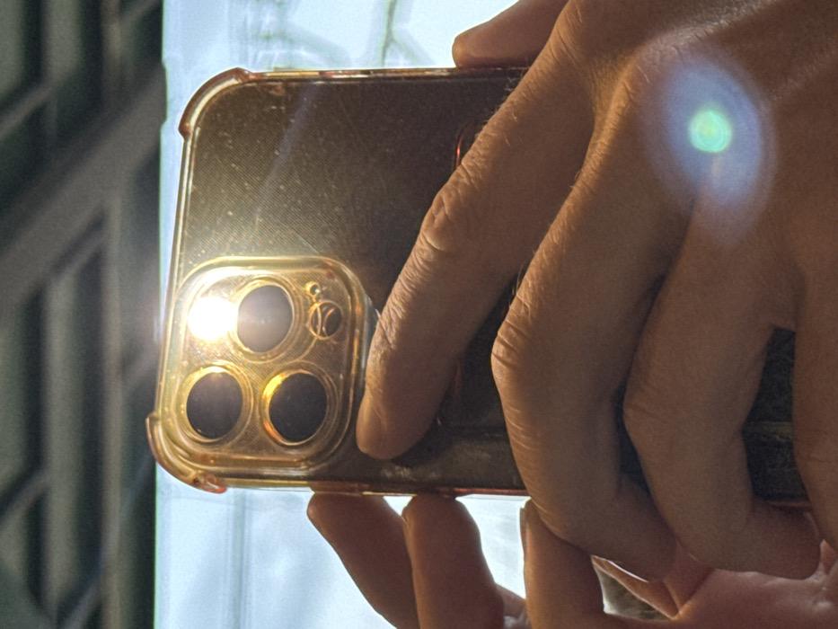 A close-up photograph depicts a smartphone, identified as an iPhone by its triple-lens rear camera system and active flash unit, held by two human hands