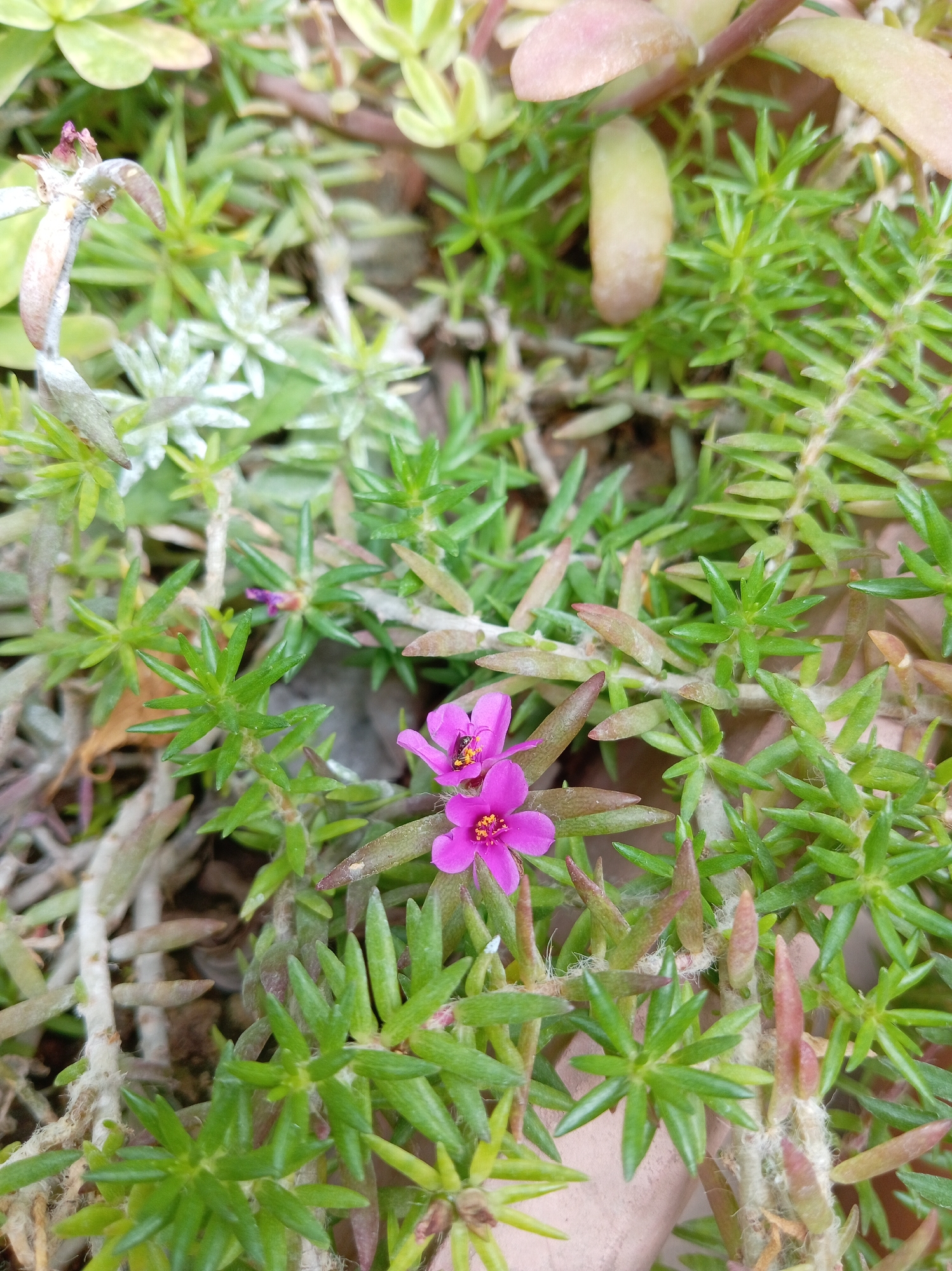 close-up of a patch of plants, predominantly a succulent with small, needle-like green leaves. There are two bright pink flowers in the center of the image, each with a yellow center and a small insect on one. Some of the plant stems appear to be covered with a fine, white fuzz. Other plants, including some with broader, lighter-colored leaves, are visible in the background. The scene is possibly located in a garden or natural area in Las Tejerías, Venezuela.