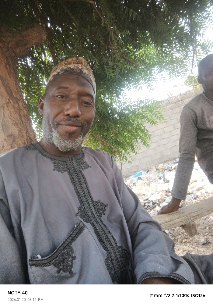 The image depicts an outdoor scene in Tudun Wada, Nigeria, featuring two adult males. The primary subject, a male of apparent middle age or older, is positioned in the foreground, looking directly at the camera with a slight smile. He has dark skin, a grey beard and mustache, and is wearing a light grey traditional tunic (jalabiya or kaftan style) with dark grey or black intricate embroidery on the placket, collar, and chest pocket. A patterned skullcap (kufi) adorns his head. To the right and slightly behind him, a second male is partially visible from the chest upwards. He has dark skin and wears a light grey long-sleeved shirt, with his right hand resting on a wooden plank that serves as a seat. Both individuals are situated under the canopy of a large tree with dense green foliage, its trunk visible on the left. In the background, behind the second male, a light-colored concrete block wall is present, and the ground in that area consists of an unpaved surface with scattered debris, including plastic materials and other refuse. The lighting suggests daylight, filtered by the tree's shade. The timestamp indicates the image was captured on 2026.01.20 at 03:14 PM.
