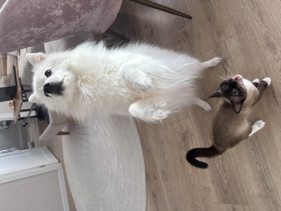 The image displays an indoor residential scene featuring two domestic animals. A small, white, long-haired dog, possibly a Pomeranian or Japanese Spitz, stands upright on its hind legs in the center-right foreground, facing slightly left and gazing upwards. A small amount of yellow substance is visible on its upper muzzle. To the lower left of the dog, a medium-sized cat with seal point coloration (light brown body with darker brown extremities and a white chest/paws) is on all fours, also looking upwards with its mouth wide open, exposing its tongue and teeth, indicative of vocalization or anticipation. The animals are positioned on light-colored wooden floorboards. In the background, a circular, off-white rug with a subtle concentric pattern is visible beneath and behind the animals. The room's walls are light-colored. Various pieces of out-of-focus furniture are discernible: a light-toned upholstered chair or ottoman is in the mid-left background, an adjustable desk with a dark laptop is positioned further back, and a pink upholstered chair with metal legs is partially visible on the right side. A white door and doorframe are present in the far-left background. The lighting suggests an indoor daytime setting. The image contains no visual information to ascertain its specific location within Perm, Russia.