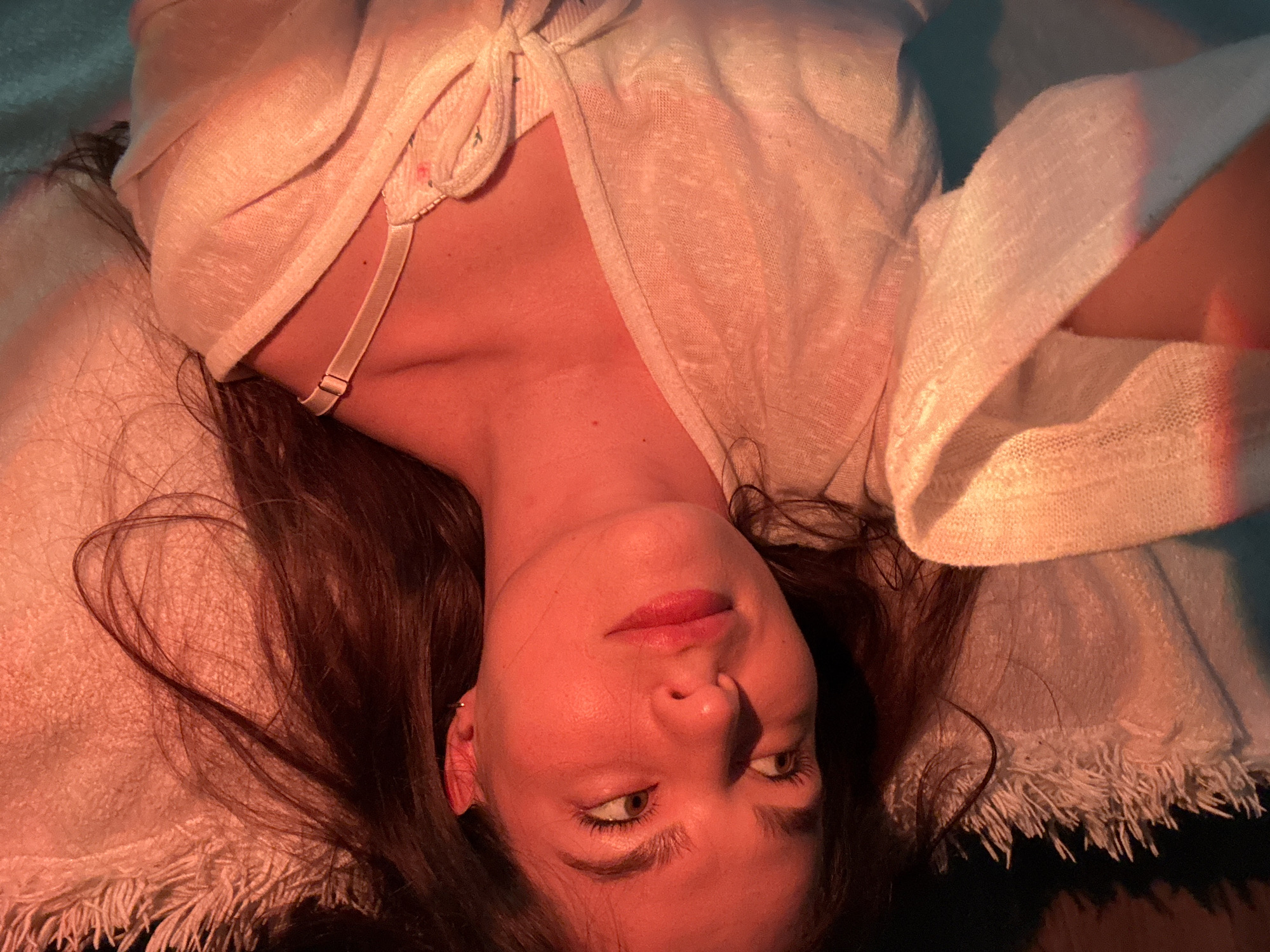 A woman is lying on a white fringed blanket or rug. She has long brown hair and is wearing a white top. The lighting is warm, with a reddish tint. The location is unknown.