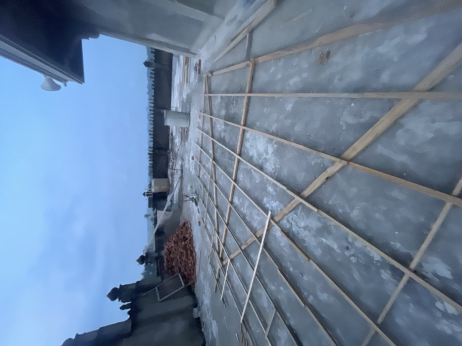 The image displays an elevated concrete platform or rooftop in Cutneuheun, Indonesia, under an overcast, blue-grey sky. A large grid of light-colored wooden battens lies directly on the textured, grey concrete surface, suggesting ongoing construction or groundwork. To the left, a mound of red bricks is situated beside a partially constructed concrete wall featuring ornamental, possibly finial-topped, structures. A rectangular frame leans against this wall. In the midground, a single white cylindrical container stands on the concrete. On the far right, a segment of a concrete structure with an overhang is visible, from which two white horn loudspeakers are mounted. The background reveals a low, dark-colored wall with a decorative, possibly crenellated, upper edge, behind which a flat, undeveloped landscape extends to the horizon under the same dim sky. No individuals are present in the scene.