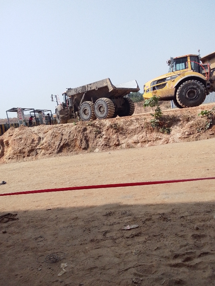 A construction site reveals two heavy-duty dump trucks parked atop a dirt mound. The first is a dark, well-used model with large tires. Adjacent to it is a bright yellow Volvo dump truck. In the background, a small structure houses a few individuals. A horizontal red line bisects the foreground, marking a boundary on the dirt ground.