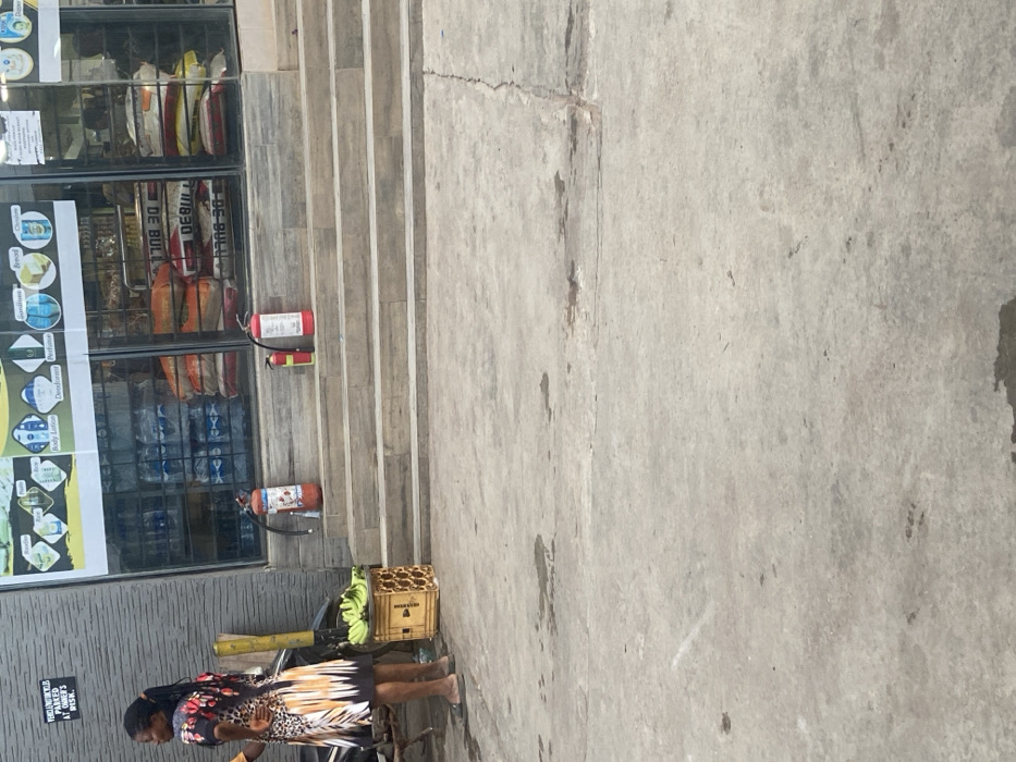 A street scene shows a shop window with a selection of goods displayed inside. Beside the shop, stairs lead up to an entrance. Three fire extinguishers are visible along the stairs. A person with a carrier is standing near the bottom of the stairs, next to a small box. A sign reads "Vehicles parked at owner's risk". The shop sells a variety of products, including toiletries and food items.