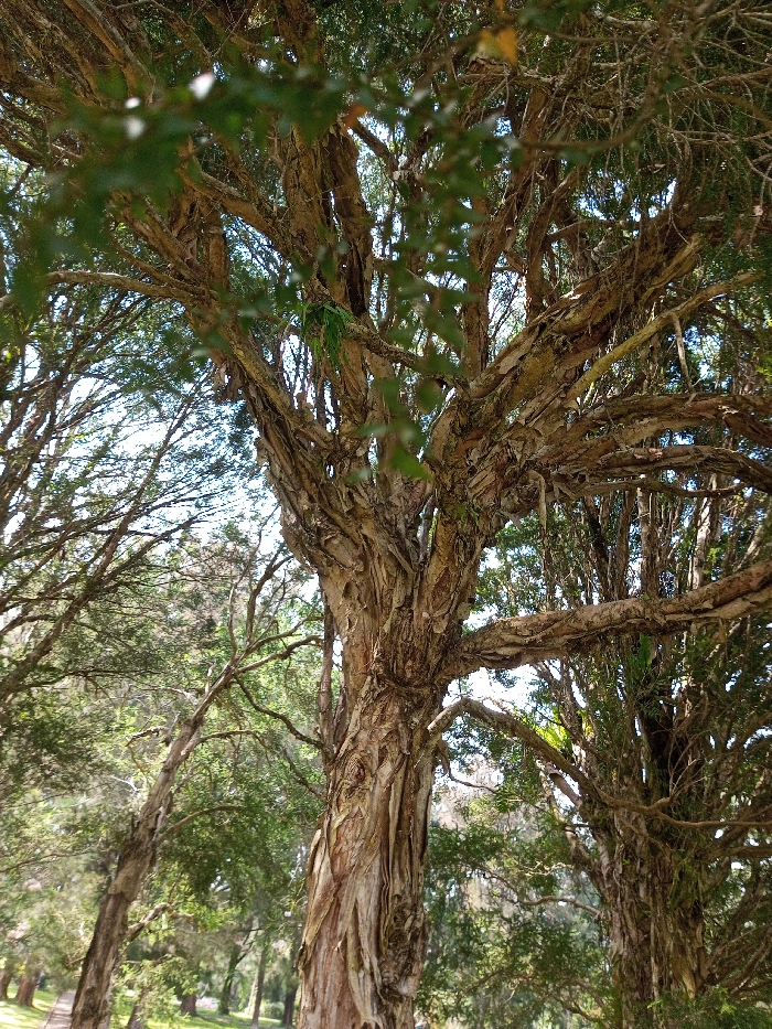 The image captures a close-up view of a tree with peeling bark. Its trunk is thick and textured, with layers of bark separating and curling away from the surface. Branches extend upwards, interwoven with foliage. Other trees are visible in the background, adding depth to the scene. The lighting is diffuse, creating soft shadows and highlighting the details of the tree's bark. The overall composition emphasizes the tree's unique texture and intricate branch structure.