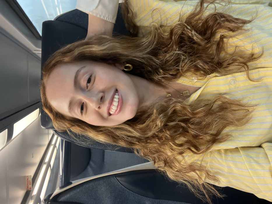 A female subject is depicted inside a passenger train car, located within the city of Kearny, United States. The subject, a young adult with fair skin and long, wavy, reddish-blonde hair, is smiling broadly at the camera, exposing her teeth. She is wearing a yellow and white striped button-up shirt. Visible accessories include gold-colored hoop earrings and two gold-colored necklaces; one features a butterfly pendant, the other a rectangular pendant with an 'E' initial. Her left hand is positioned behind her head, appearing to touch her hair. The train interior features rows of blue and gray upholstered seats with dark plastic backs. Overhead fluorescent lighting illuminates the cabin. A red "EMERGENCY EXIT" sign with a white arrow pointing left is affixed to the upper wall. A blurred exterior is visible through a window section on the right side of the frame.