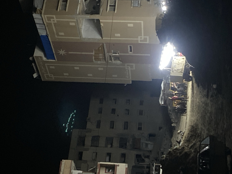 This nighttime image captures a scene in Khan Yunis, Palestinian Territory, focusing on urban structures and a gathering of individuals amidst what appears to be a damaged environment
