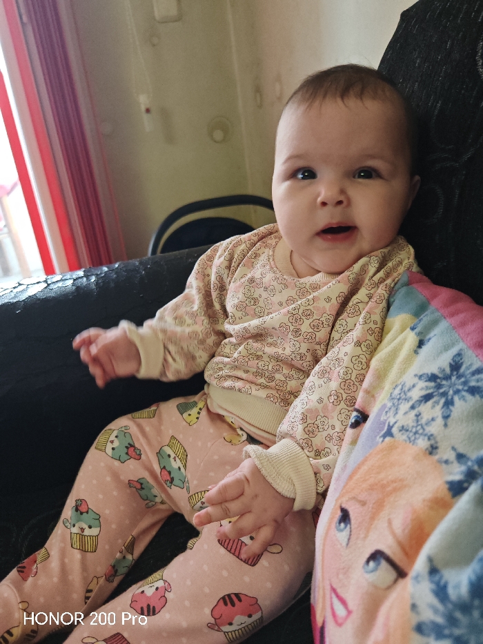 The scene depicts an infant in an indoor domestic setting located in Haskovo, Bulgaria. A light-skinned baby with dark hair and open eyes is centrally positioned, facing slightly right and looking directly forward with its mouth slightly ajar. The infant wears a light-colored long-sleeved top with a repeating pattern of small pink and brown flowers, and pink pants featuring a repeating pattern of various colored cupcakes. The baby is seated on a dark, possibly black, textured surface, likely a sofa or chair. To the right of the infant, a multicolored blanket or pillow with an image of an animated character (resembling Elsa from Disney's Frozen) is partially visible. The background to the left reveals a window with vertical red and white striped curtains. Above and to the left of the infant, a light-colored wall is visible, showing a circular object, possibly a light fixture or smoke detector, and another dark object resembling the back of a chair. The overall lighting suggests an interior illuminated by natural light from the window.