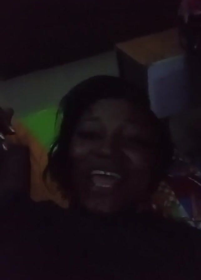 A woman with short dark hair and a dark shirt is lying down on a bed and looking at the camera. She is smiling and talking. The background is dark. Behind her, there is a headboard and a nightstand. There is a green and orange pillow under her head. The sheets on the bed are patterned with bright colors.
