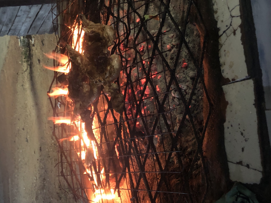 The image displays a nighttime scene in Adankolo, Nigeria, featuring food being grilled over an open fire