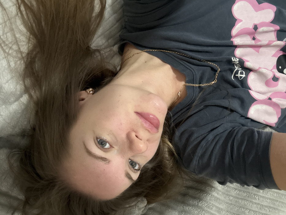 A single adult female is depicted lying on a grey, textured fabric surface, presumed to be an indoor setting in Batumi, Georgia. She is positioned with her head towards the top of the frame and her body angled slightly downwards to the right. Her light brown hair is spread out around her head on the grey surface. She has light-colored eyes and her gaze is directed towards the camera. Her lips appear glossy. She is wearing a dark blue/grey short-sleeved t-shirt featuring a pink and white "Disney Mickey" graphic on the front. A thin gold-colored chain necklace is visible around her neck, and a small gold-colored stud earring is present in her right ear. No other individuals or significant objects are visible, and there are no discernible interactions. The lighting suggests an interior, possibly artificially lit environment.