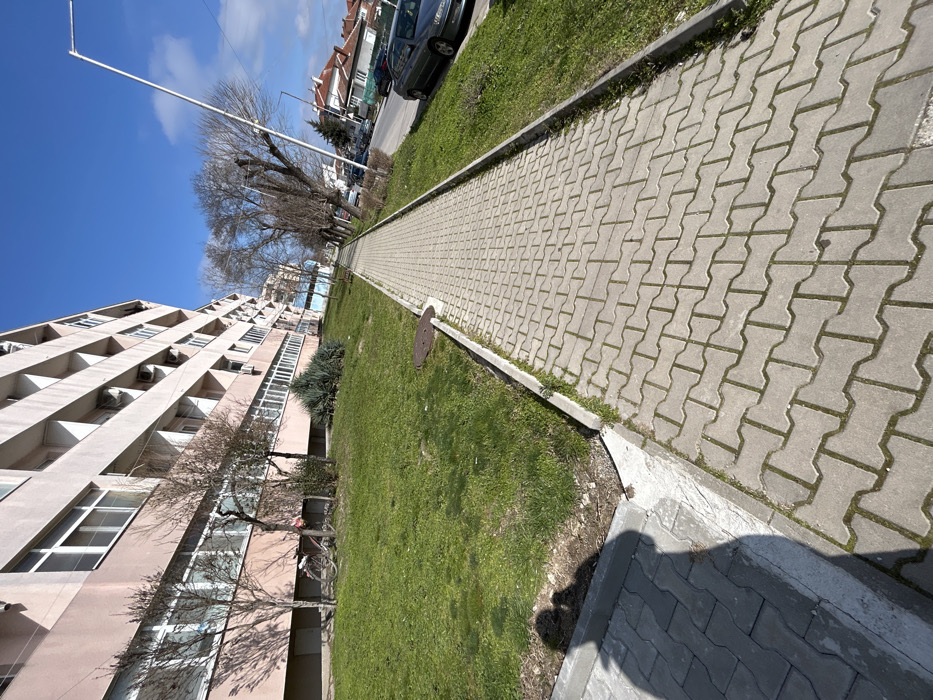 The image depicts an urban street scene in Elhovo, Bulgaria, under a clear blue sky with sparse white clouds, indicative of daytime. On the left, a multi-story building with a pale peach-colored facade extends into the background. It features multiple rows of white-framed windows and numerous individual exterior utility projections, some equipped with air conditioning units. A sloped grassy area, showing patches of both lush green and drier vegetation, lies between the building and the pedestrian path. Within this grassy strip, several small, leafless deciduous trees and evergreen shrubs are present. A light-colored bicycle with a red frame leans against the building, partially obscured by a small tree. A circular metal manhole cover is embedded in the grass near the sidewalk. A long, straight pedestrian sidewalk, constructed from gray, interlocking concrete pavers, extends from the foreground into the background, narrowing with perspective. The sidewalk is bordered on both sides by concrete curbs, with some moss and vegetation growing in the paver joints and along the curbs. To the right of the sidewalk, another strip of green grass and several leafless trees line what appears to be a paved road. Multiple vehicles are parked along this road, including a dark grey sedan in the foreground. A tall, white street lamp post with a horizontal arm is positioned on the right side of the sidewalk. A light-colored park bench is partially visible further down the street on the right. In the immediate foreground, a large, dark shadow, likely cast by the photographer, extends from the bottom left corner onto the sidewalk and grassy area. No individuals are directly visible in the scene.