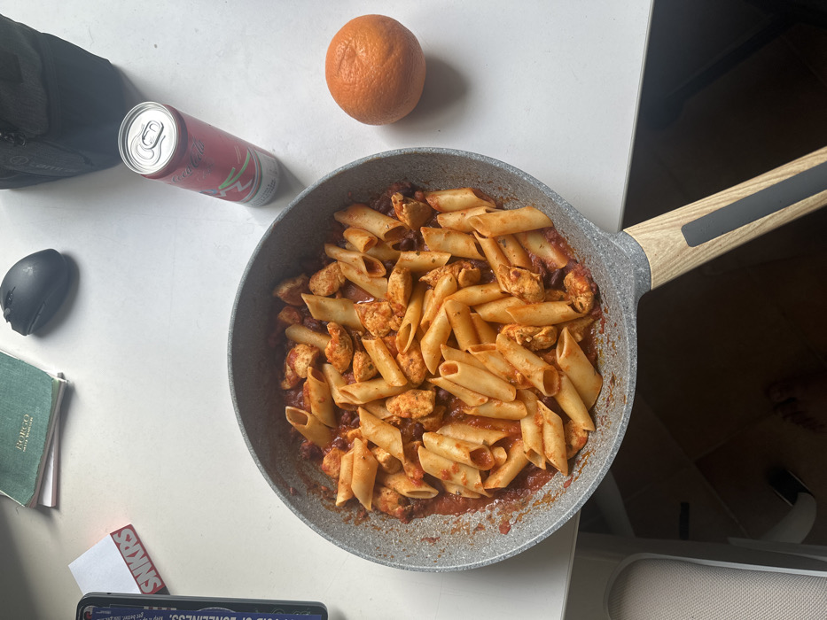 The scene depicts an overhead view of a meal prepared in a grey non-stick frying pan, positioned on a white tabletop in what is indicated to be a location in Milan, Italy. The pan contains penne pasta mixed with diced chicken pieces, kidney beans, and a red, possibly tomato-based, sauce. Arranged around the pan on the white surface are several items. To the right of the pan, a single whole orange is visible. Above the orange, a red Coca-Cola Energy drink can stands upright. In the upper left quadrant of the table, a black computer mouse rests next to a small stack of two notebooks, the top one dark green with "BORGO" printed on its cover. Partially visible on the far left edge is a smartphone displaying text that includes "VOID OF LONELINESS" and "SNKRS." A dark, possibly black, bag or object is partially visible in the upper right corner. The lighting appears natural, casting soft shadows. No individuals are present or visible, and no active interactions are depicted.