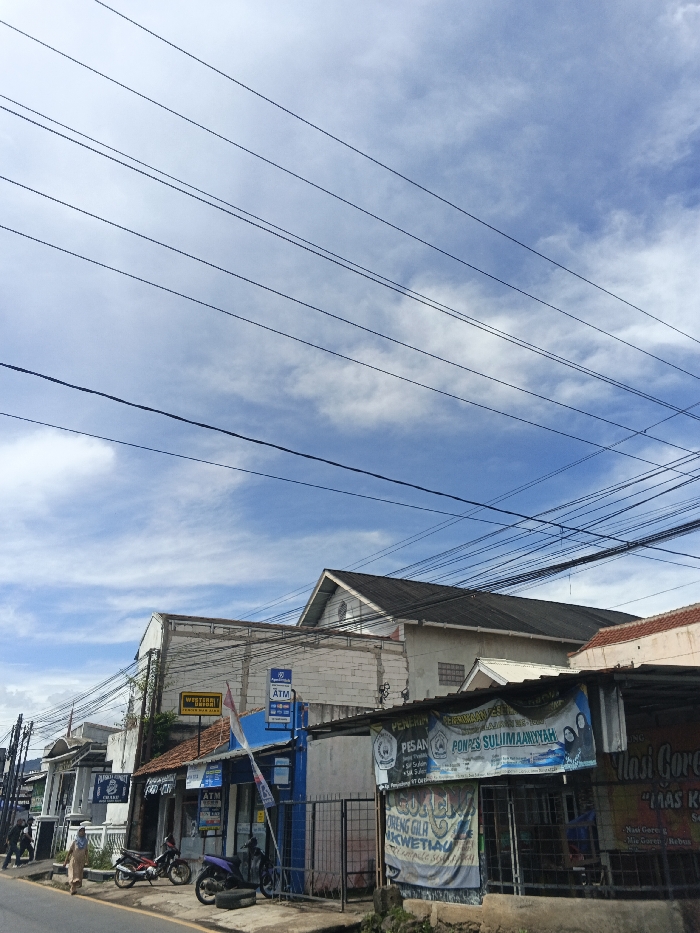 street scene under a blue sky with scattered clouds. Power lines crisscross overhead. Several buildings line the street, including structures housing an ATM and a "PENERIM" store. Banners advertise services such as "PESAN PONPES SULLIMAAMYAH" and "ORENG GILA KWETIAU." There's also an advertisement for "NASI GORE" and "lasi Gove." Two motorcycles are parked by the curb.