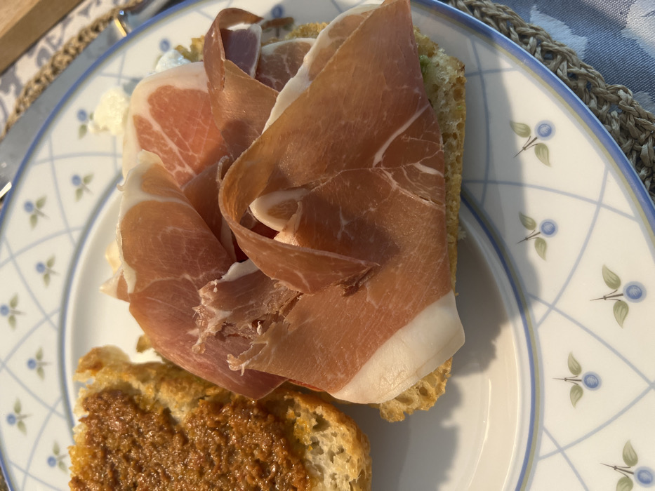 The image displays a close-up view of an indoor dining scene, featuring food on a plate. The precise location within Mexico City, Mexico, is not discernible from the visual evidence. The central subjects are two pieces of prepared bread, resembling open-faced sandwiches or bruschetta. On the left, a piece of toasted bread is covered with a thick, reddish-orange, textured spread, indicative of a savory paste like pesto. On the right, another piece of toasted bread is topped with multiple thin, irregularly folded slices of cured ham, consistent with prosciutto. Lighter-colored ingredients, possibly cheese or a creamy spread, are visible beneath the ham. The food rests on a white ceramic plate with a decorative rim. The rim features a pattern of intersecting light blue lines and small blue berry-like motifs with light green leaves. A silver-colored utensil handle is partially visible at the upper right edge of the plate. The plate is positioned on a woven placemat, which appears to be made of natural fibers. This placemat is placed on a light-colored, possibly fabric-covered, surface. No individuals or active interactions are depicted. The environment suggests a domestic or restaurant dining setting.