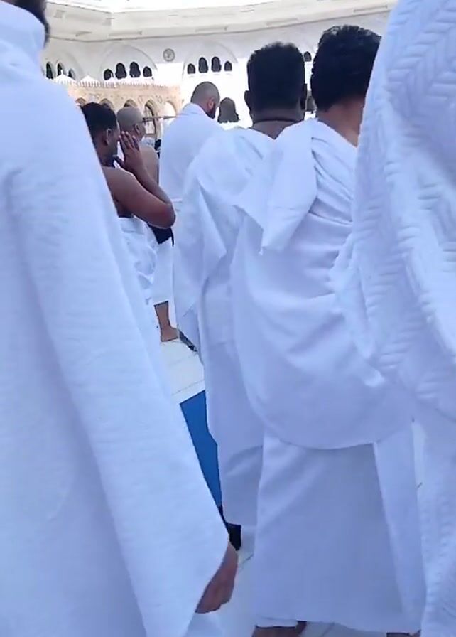 group of people, mostly men, walking in the direction of the Kaaba in Mecca, Saudi Arabia