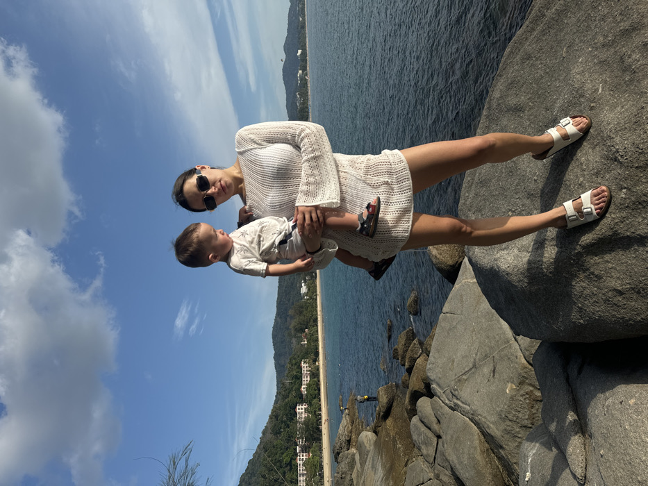 An adult female, wearing a white knitted cover-up, dark sunglasses, and white sandals, stands on large grey boulders while holding a young child. The child, wearing a light-colored, patterned t-shirt and multi-colored sandals, is held facing slightly away from the camera and looking downwards. The scene is situated on a rocky section of Karon Beach, Karon, Thailand. To the left of the subjects, a sandy beach extends along the coastline, with multiple individuals visible, including one person fishing in the shallow water. The beach is backed by green, tree-covered hills and several multi-story resort buildings. The dark blue ocean water occupies the right side of the frame. In the distant background over the water, more hills are visible, along with a bright blue sky containing scattered white clouds and a distant parasail. The scene is brightly lit by natural daylight.
