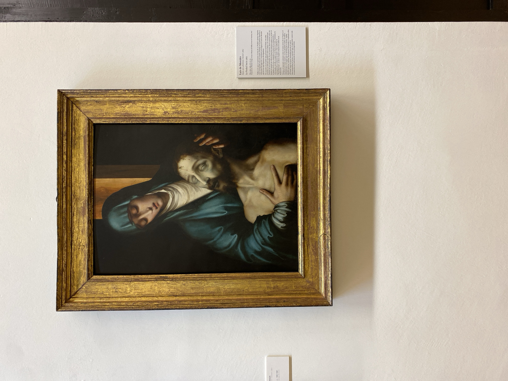 A framed oil painting, "La Piedad" by Luis de Morales (circa 1565), is displayed centrally on an off-white, textured wall