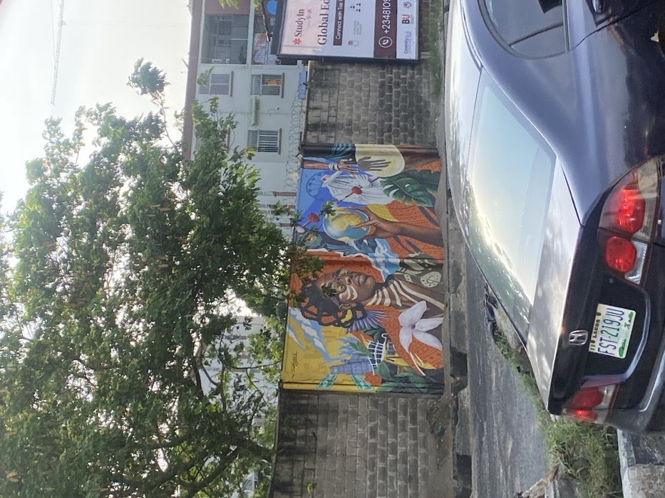 A colorful mural adorns a brick wall next to a parked black car with a Nigerian license plate