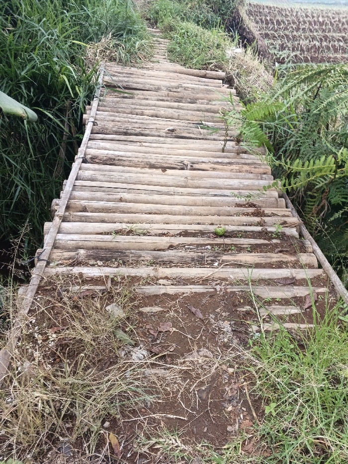 - "The image displays a rustic wooden pathway or bridge ascending slightly and curving gently to the left, situated in a rural, overgrown environment consistent with Pinnwe, Myanmar (Burma)" by FM-v1ZZk2, licensed under CC BY 4.0