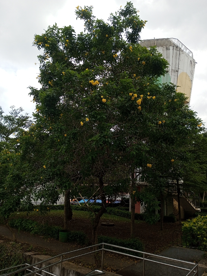 The image captures a landscaped area in Daringbadi, India, under an overcast sky. A large tree with dense green foliage and numerous clusters of yellow flowers stands prominently in the central and left-mid portion of the frame. To the upper right, a multi-level concrete utility structure, possibly a water tower or observation deck, is visible; it features a white upper section with a metal railing and shows remnants of green and yellow paint on its exterior. An external metal-railed staircase descends from the right side of this structure. In the lower foreground, concrete steps with metal railings are present. The ground consists primarily of exposed soil with interspersed green shrubbery, and a dark green cylindrical waste bin is situated near the base of a tree in the mid-ground. No persons are visible within the scene.