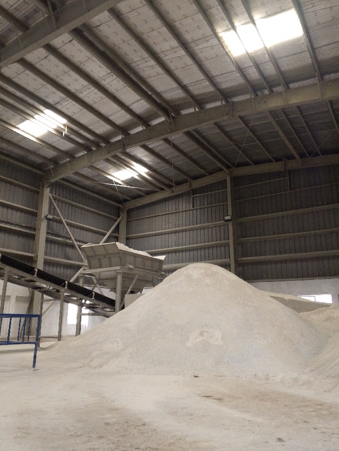 interior of a large industrial building located at latitude 22.694 and longitude 90.601 in the city of Pangasia, Bangladesh. The building appears to be a factory or warehouse, with a high ceiling supported by steel beams. The roof is made of metal panels, with several skylights allowing natural light to enter the space. In the foreground, there is a large pile of white aggregate material, likely sand or gravel, filling most of the floor space. To the left of the pile, a conveyor belt runs along the wall, leading to a metal hopper. The walls of the building are made of concrete and painted a light gray color. There are no people present in the scene. The image suggests a typical working environment of a factory.