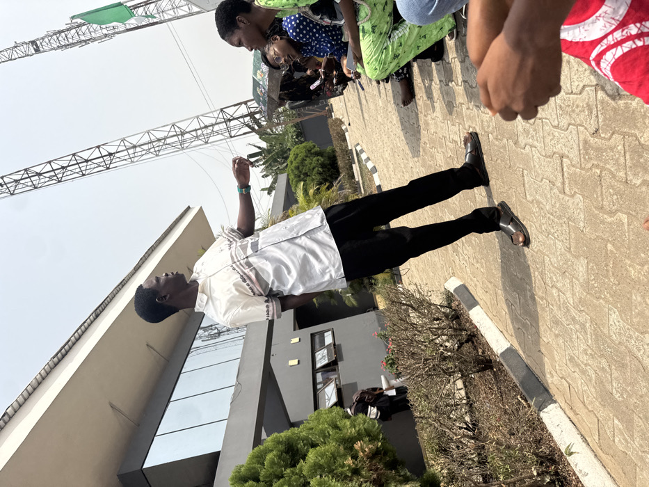 The image captures an outdoor scene on paved grounds adjacent to a modern building, likely within an institutional campus or public area in Ife, Nigeria