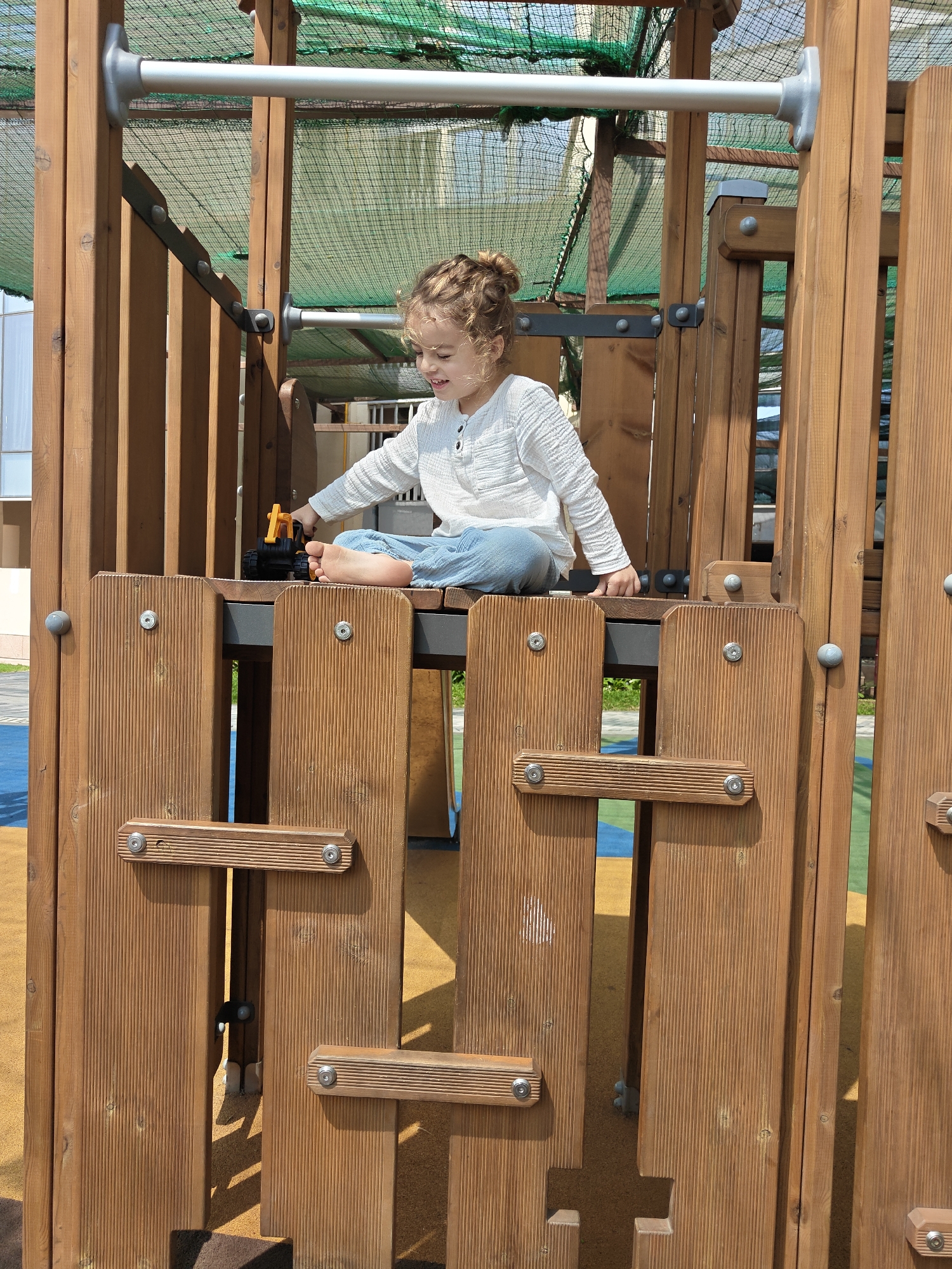 A young child with curly hair, styled in a small bun, is sitting barefoot on a wooden structure in what appears to be a playground