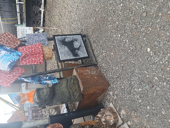 A display of assorted goods sits atop a black metal structure. Decorative pillows with various patterns like giraffe print and tropical leaves are visible. A framed artwork with an abstract black design is also on display. Below, a stone-like sculpture of a gorilla's head rests near a rusted metal container. The ground surrounding the display is covered in gravel. Part of a train wheel is visible in the upper left corner.