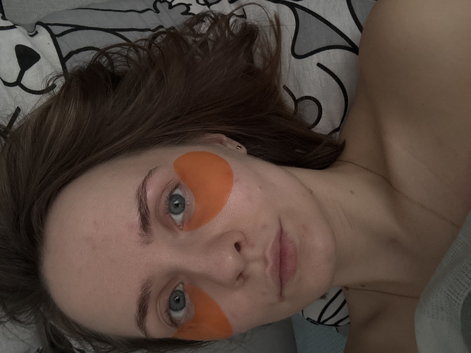An individual, appearing to be an adult female with brown hair and light-colored eyes, is depicted from a top-down perspective, lying on a bed in what is presumed to be a residential setting within the city of Perm, Russia. The subject's face is central, with two orange, semi-transparent hydrogel patches applied under each eye. Her gaze is directed towards the camera. Minor skin imperfections are visible on her face. Her hair is loosely arranged around her head and shoulders, which appear bare or partially covered by bedding. A thin, gold-colored chain necklace is visible around her neck, and a small, light-colored stud earring is present in her right earlobe. She is resting on a pillow with a patterned, light grey and black pillowcase. A light-colored sheet or blanket is partially visible in the lower left portion of the frame.