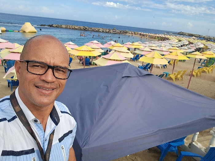 The image portrays a crowded beach scene in Macuto, Venezuela. In the immediate foreground, a bald adult male with dark skin, wearing black-rimmed glasses and a short-sleeved blue and white striped collared shirt with a lanyard, smiles directly at the camera. A large, dark gray canopy covers the lower right portion of the foreground, partially obscuring blue chairs beneath it. Beyond this, a sandy beach is densely occupied by numerous beach umbrellas, primarily featuring alternating yellow and light pink panels. Associated with these umbrellas are multiple blue and yellow plastic chairs. A significant number of individuals are visible on the beach and in the ocean, engaged in leisure activities such as swimming and wading. In the water, towards the left, a large, yellow, pyramid-shaped inflatable structure is present. A long rock breakwater extends horizontally across the mid-ground, separating the beach area from the deeper blue ocean under a sky with scattered white clouds.