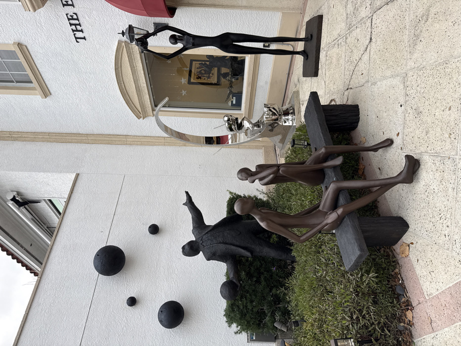 The image displays an exterior scene in Naples, United States of America, featuring a building facade with multiple sculptures