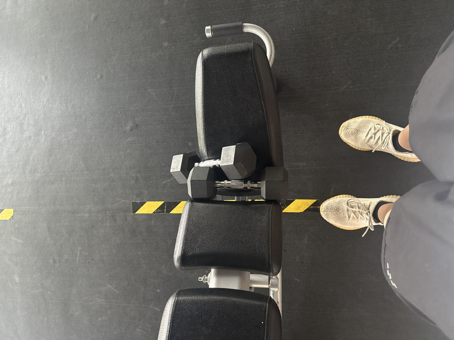 The image provides a top-down view within a fitness facility in Santa Catarina, Mexico. The floor is dark gray, marked by a prominent yellow and black striped line running vertically through the center. A black, adjustable weight bench with a silver-colored frame is positioned horizontally across this floor marking. Two hexagonal black dumbbells rest on the padded surface of the bench, centered between its two main sections. In the foreground, the lower torso, legs, and feet of a person are visible. The individual is wearing dark athletic shorts, light-colored athletic shoes with textured soles, and dark socks, with their feet positioned on either side of the yellow and black floor line.