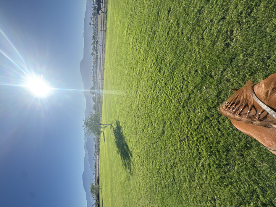 An outdoor scene features a vast green lawn under a bright, sunny sky. In the distance, mountains fade into the horizon. A lone tree casts a long shadow across the grass. The foreground reveals a brown horse, its mane styled with braids and adorned with white accents. The image appears to be taken from the perspective of someone riding the horse, showcasing a clear day and expansive landscape.