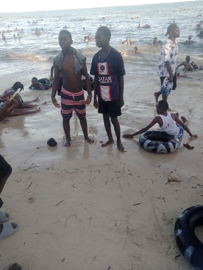 The image displays a bustling beach scene within Shanzu ward, Kenya. The foreground consists of damp, light-brown sand mixed with dark green seaweed fragments. Partially visible in the bottom-left corner are a person's feet clad in light-colored sandals. Two young males stand barefoot in the central midground. The male on the left is shirtless, wearing red, white, and blue striped swim shorts with a white drawstring, and has a grey fabric draped over his left shoulder. The male on the right wears a purple, white, and black soccer jersey bearing the "QATAR AIRWAYS" logo and dark shorts, with a necklace. A dark, rounded object, identified as a coconut, lies on the sand between them. To the right of these two, an adult male walks from right to left, away from the water. He wears a white short-sleeved shirt with a tropical pattern, dark shorts, and a dark cap, carrying a blue and white object in his left hand. Further to the right, a young male lies on the wet sand, oriented away from the camera, alongside a black inflatable tube with white markings. He is dressed in a white tank top and patterned swim shorts. To the far left, several individuals are partially visible, sitting or lying on the sand, with one hand holding a green stick-like object. The background shows the Indian Ocean, populated by numerous people swimming, wading, and utilizing inflatable tubes. The water exhibits small waves near the shore under a bright, overcast sky.