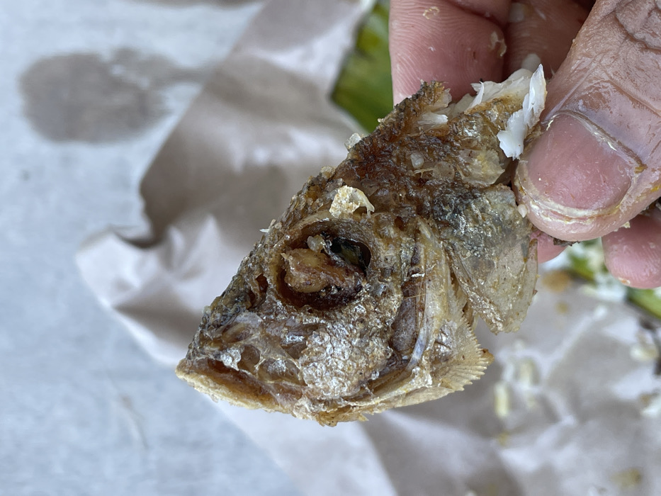 A human hand, with fingers exhibiting yellowish stains, holds a partially consumed, deep-fried fish head