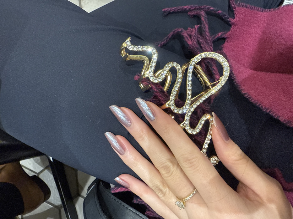 A woman's hand with long, iridescent silver nails rests on a pair of dark pants, adorned with a gold-toned hair clip shaped into a word, possibly "Love," studded with sparkling stones